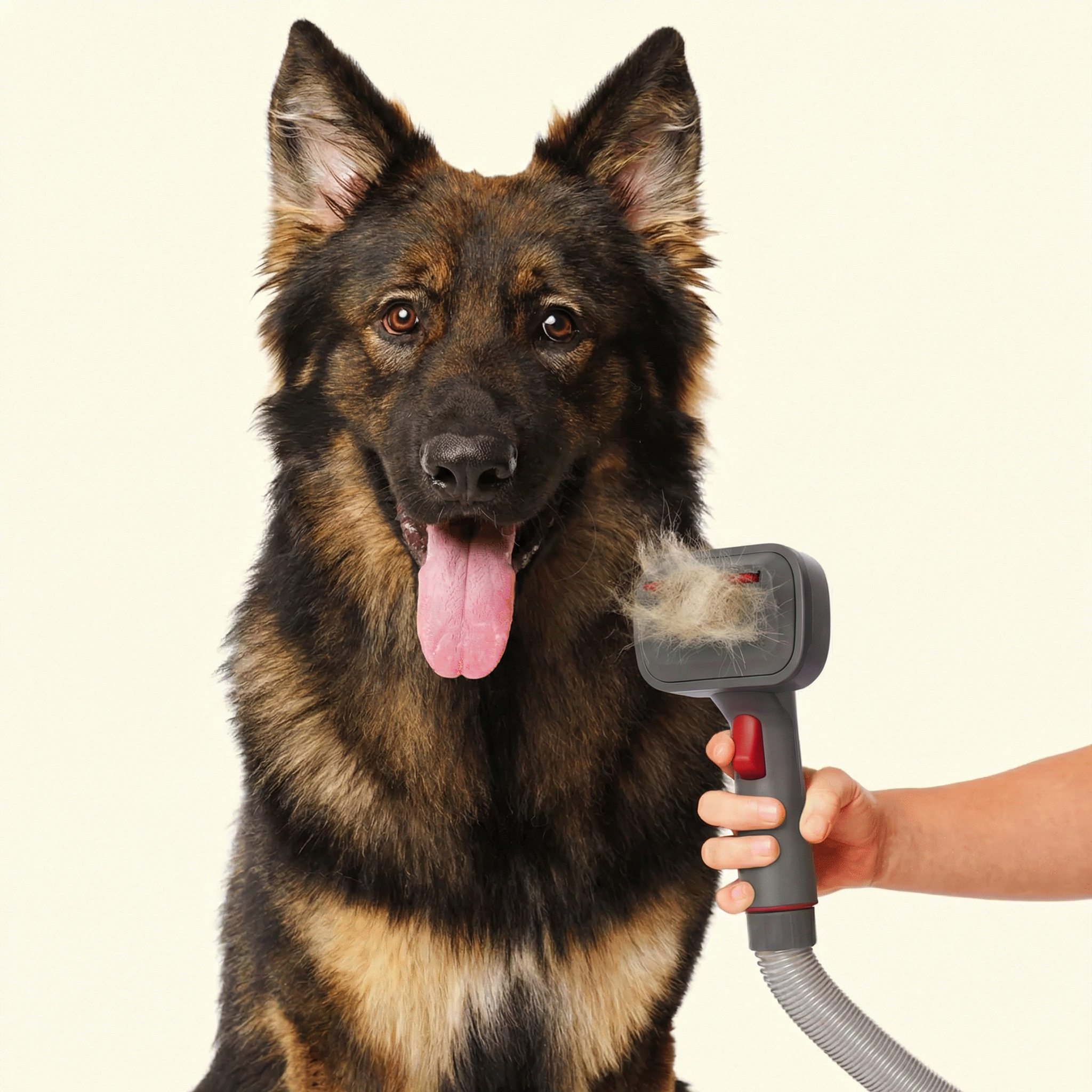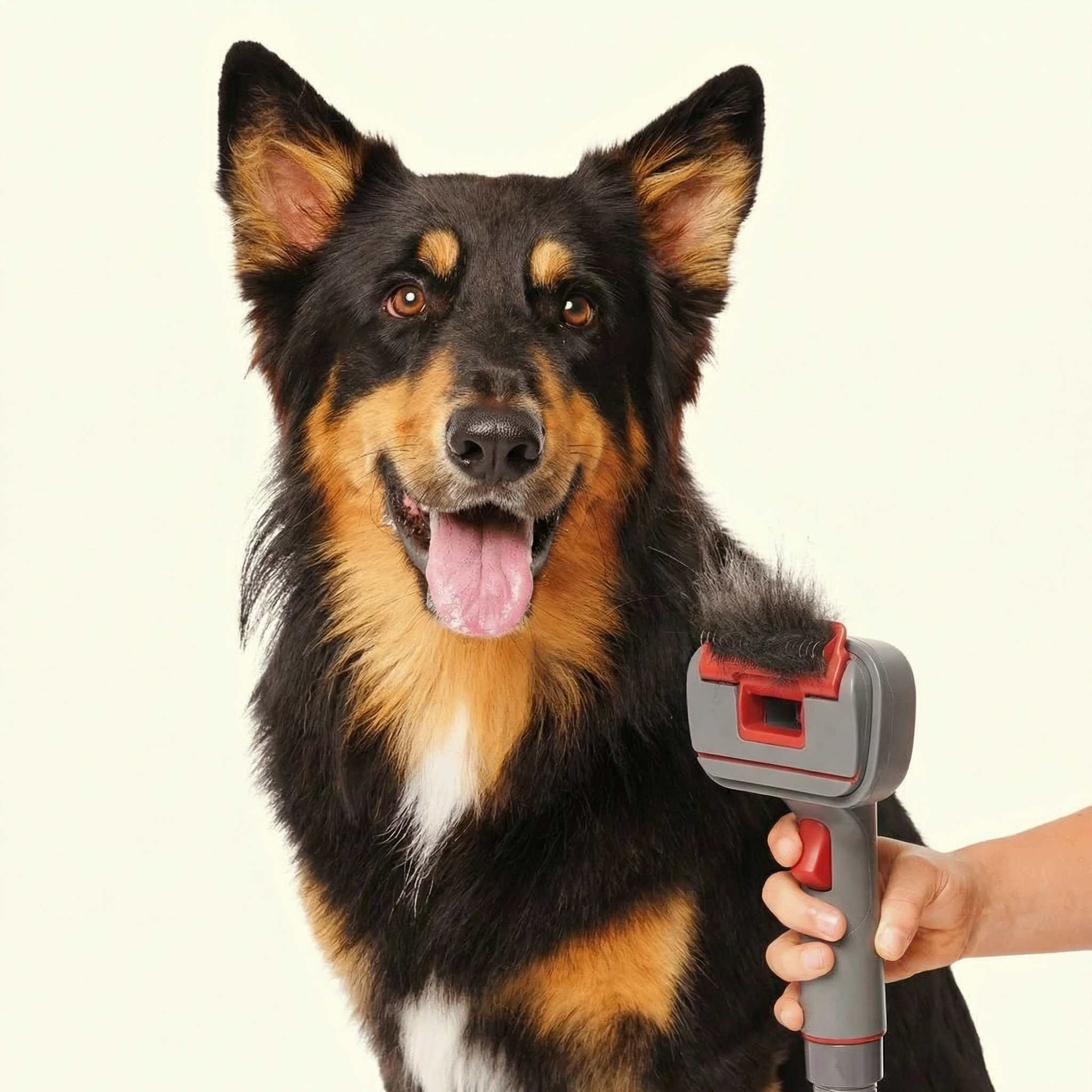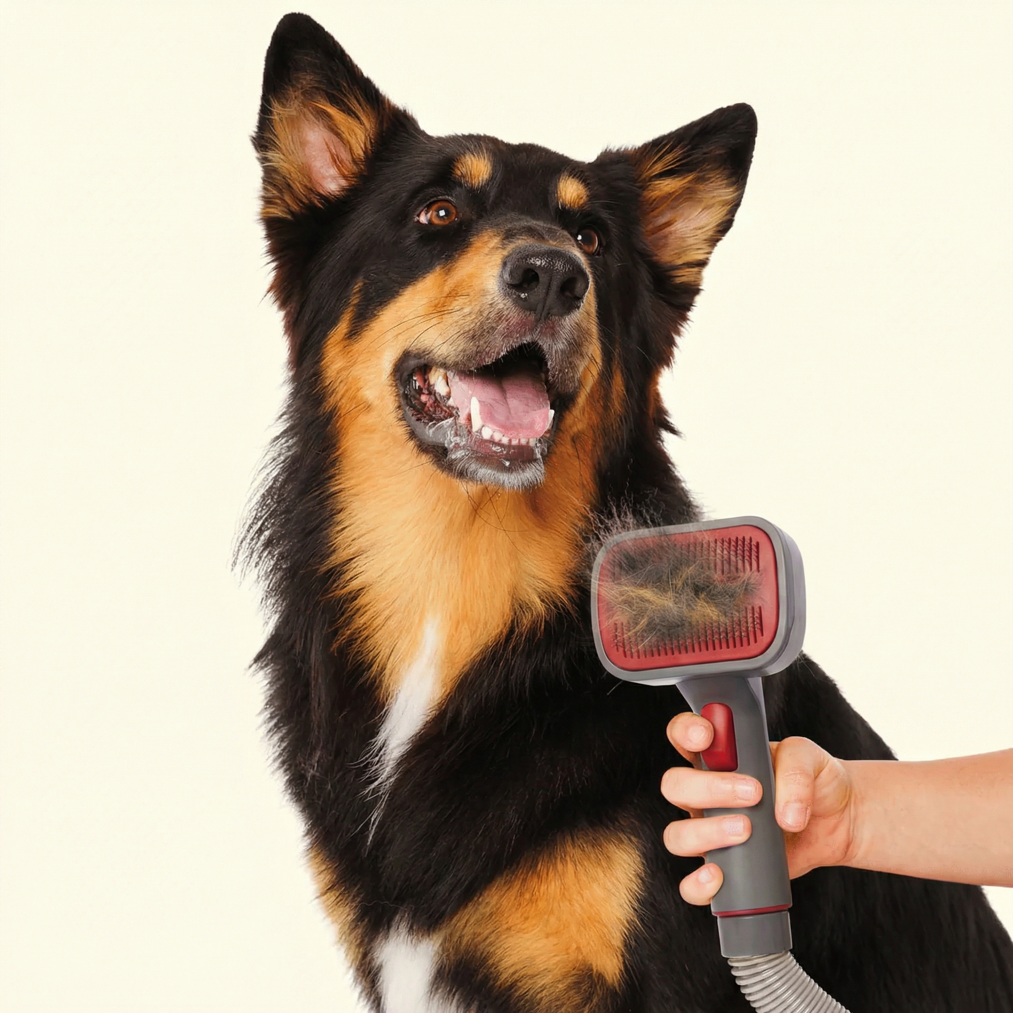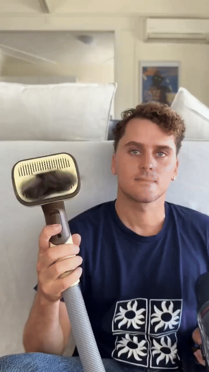 Groomly™ removes significantly more loose fur in a single session because it lifts, de-sheds, and vacuums at the same time — no repeated brushing needed.